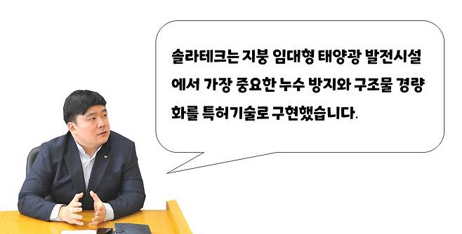 “국내 태양광 EPC 업체 중 활발하게 사업을 시행하는 곳은 6~7개사 정도인데, 부침이 잦은 편입니다. 2016년 창업한 저희 솔라테크는 태양광 구조물생산에 필수적인 자동 펀칭 롤포밍(roll forming) 기술을 34년간 연구 개발 해온 정우이엠씨의 사내벤처로 출범했습니다. 모회사의 기술력과 솔라테크의 아이디어로 개발하여 특허를 취득한 누수방지레일 등 20여 가지의 구조물을 직접 생산하여 적용하는 것이 최대 장점이고 경쟁력입니다”