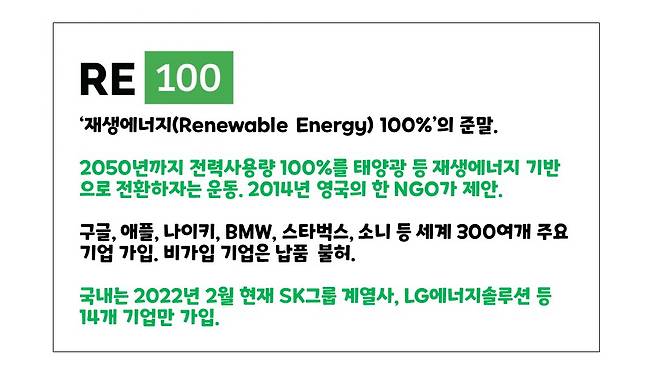 아이러니하게도 정치적 학습효과로 국민 유행어가 된 ‘알이백(RE100)’은 사실 인류의 생존을 위해 시급한 실행과제다. 2050년까지 모든 사업장에서 사용하는 전력량의 100%를 태양광 등 재생에너지(Renewable Energy)로 전환하자는 전지구적 운동이다.