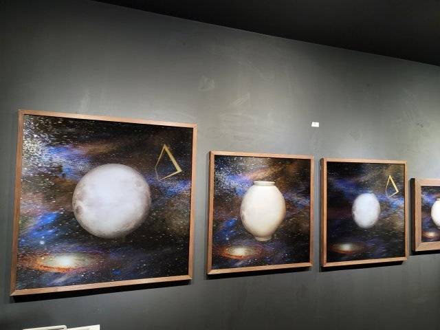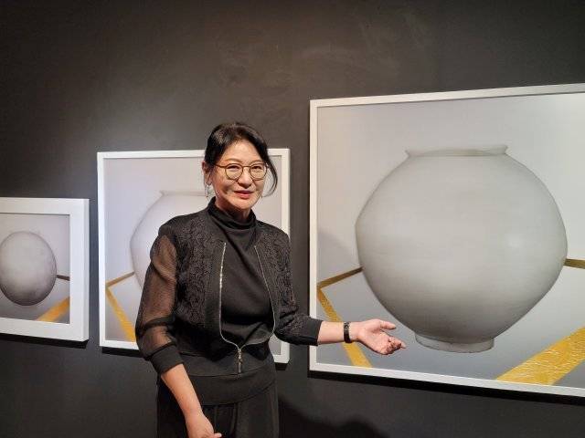 “10월에 오픈하는 경기도청사 1층 로비에 설치되는 10폭짜리 족자(가로 30m) 작품 중의 하나로 달항아리 작품이 들어간다. 10폭짜리 족자에는 그림과 렌티큘러 작품, 미디어아트가 융합된 작품들이 들어간다. 지난해에 8개월에 걸쳐 이 작품을 만들고 있던 중 뉴욕에 살고 계시던 어머니가 돌아가셨다. 그런데 코로나19 때문에 어머니 장례식에 갈 수가 없었다. 작품 완성기일이 임박해서 미국에 다녀오면 자가격리 때문에 작업을 완료할 수가 없었다. 그래서 유튜브로 장례식을 치르면서 정말 울면서 작업을 했다. 2018년에 아버지가 뉴욕에서 돌아가셨을 때 물려주신 달항아리가 있었다. 부모님을 그리워하며 밤하늘의 달을 쳐다보면서, 하늘나라에서 평안하게 쉬시길 기원하면서 달항아리 시리즈를 시작하게 됐다. 방 안에 놓인 달항아리가 우주로 올라가 둥그런 보름달로 변화하는 작품이다.”