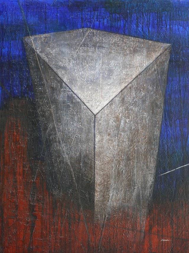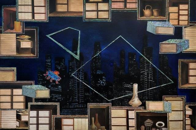 “2000년도부터 조선시대 민화를 추상적으로 표현하는 작업을 해왔어요. 뉴욕에 있는 친정집에서 머물며 2년 동안 작업을 했는데, 너무 어려웠습니다. 그래서 민화니 꽃이니 다 빼고 나를 그리자고 생각했습니다. 쓰러질 듯 위태롭게 서 있는 콘크리트 빌딩이 제 자신이라고 생각했습니다. 비뚤어진 6면체 건물은 현실에서는 가능하지 않은 모양이다. 원근법에도맞지 않는 기하학적 조형물이다. 내 불안한 현재의 심리상태를 있는 그대로, 잘 표현해주는 것 같았습니다.”