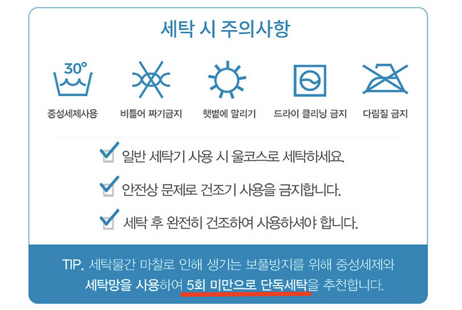 단선 위험이 있으니 울 코스로 세탁해야하며,
