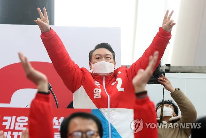 (대전=연합뉴스) 이정훈 기자 = 국민의힘 윤석열 대선 후보가 15일 오후 대전 중구 으능정이 문화의거리 유세에서 지지자들을 향해 인사하고 있다. 2022.2.15 [공동취재]
