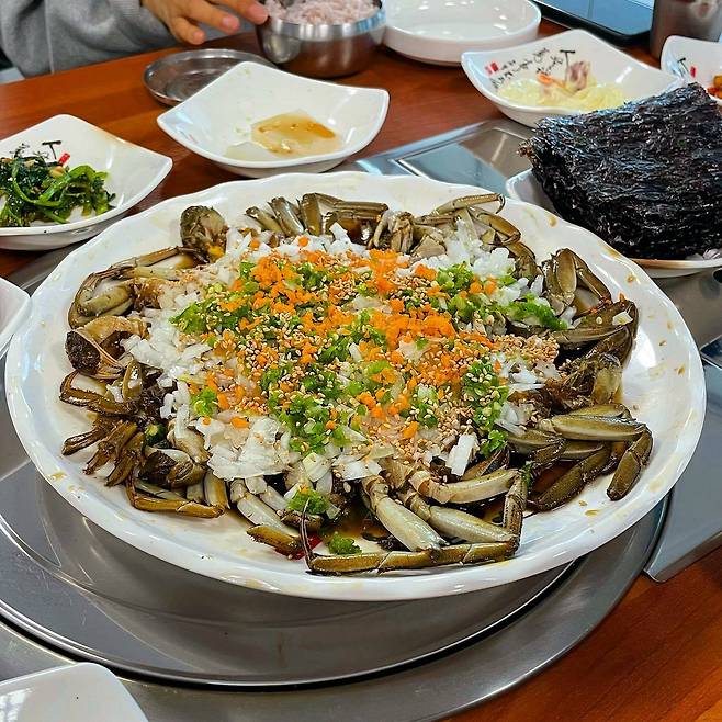 [식신TIP] 수북한 야채의 단맛이 게장 간장에 배어들어 먹으면 먹을수록 맛있어져요. 꽃게와 달리 참게는 작아 먹을 것이 별로 없지만 감칠맛 만큼은 최고.. 향긋한 생김에 싸먹어도 좋아요.