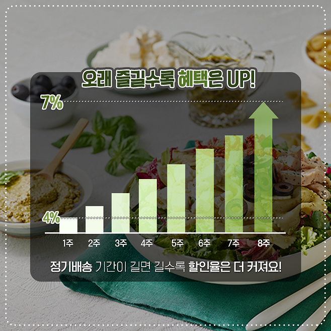 내가 지정한 시작일에 따라, 한치의 오차도 없이 정확하게 샐러드가 배송되는 프레시코드! 1주 정기구독하면 정해진 금액에서 3% 할인을, 최장기간인 8주 동안 정기구독하면 6% 할인을 받을 수 있으니 기간을 선택하여 맛있는 샐러드를 즐길 수 있겠습니다!