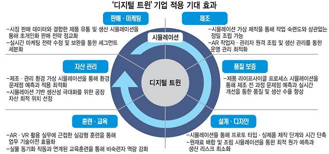 기업에서는 디지털 트윈을 통해 현실 문제를 가상공간에 투영할 수 있다. 가상공간에서 현실의 문제점을 실험하고, 가상공간에서 도출한 실험 결과는 다시 현실의 사물에 적용해서 문제를 개선한다. 현실과 가상이 실시간으로 동기화돼 순환하는 과정이 기업에서 활용할 수 있는 디지털 트윈이다. 디지털 트윈 역시 과거 CPS(Cyber Physical System)로 불리던 기술과 의미상으로는 크게 다르지 않다. 최근 빅데이터, 인공지능(AI), 사물인터넷(IoT), 증강현실(AR), 가상현실(VR) 등 기술 발전과 결합해 과거와 다른 혁신적인 성장을 보일 것이라는 기대감이 응축되고 있다. 무엇보다 가상 환경 실험 결과가 현실세계에 그대로 적용된다는 점에서 '현실적 활용'에 대한 매력도가 높다.