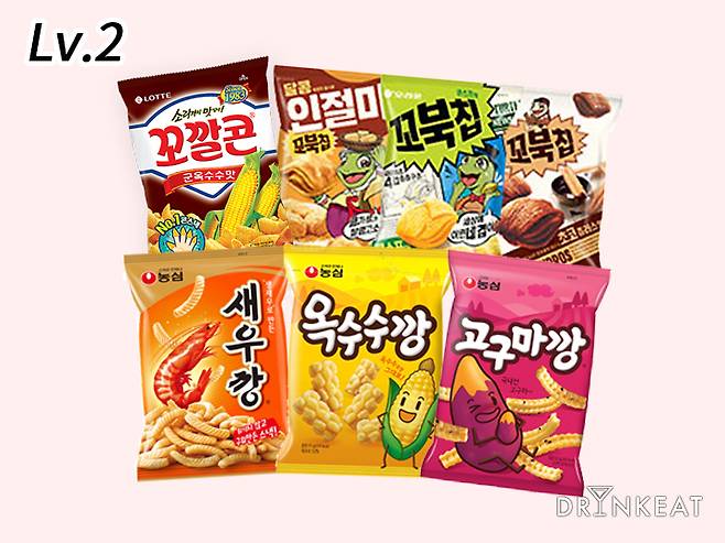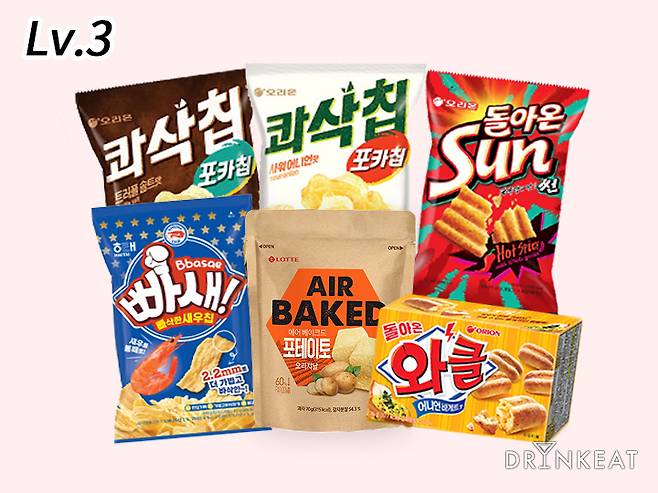 대부분의 과자가 이에 속한다. 제법 바삭한 식감을 뽐내지만, 빠삭-정도의 식감은 아니기에 ‘준 바삭’ 과자라 칭해보겠다. 2020년 깡 열풍을 일으킨 농심의 깡 시리즈도 적당한 바삭거리는 식감을 뽐내는 과자다. 또, 4겹으로 풍성한 식감을 자랑하는 꼬북칩도 식감이 좋은 과자로 꼽겠다.