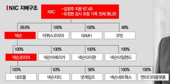 넥슨의 기업 지배구조를 보면 김 창업자(67.49%)와 그의 가족이 최상위 지배회사인 NXC 지분 대부분을 보유하고 있다. NXC는 본사인 넥슨 일본법인의 지분 28.5%를 직접 보유하고, 100% 자회사인 벨기에 투자법인(NXMH)을 통해 18.8%를 간접 보유한다. 일본 법인 넥슨은 넥슨코리아를, 넥슨코리아는 네오플, 넥슨지티 등 주요 계열사를 거느리고 있다.