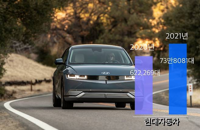 지난해 12월 본격 판매를 시작한 E-GMP 기반 순수 전기차 아이오닉5는 153대에 그쳤다. 현대차 미국 법인은 전체 판매량 집계가 끝나면 미국 시장 점유율이 전년 대비 약 1%p 상승한 5.2% 이상을 기록할 것으로 기대하고 있다. 올해에는 아이오닉 5가 미국 동부와 서부 지역 배송을 시작하고 산타크루즈와 SUV 라인업에 주력해 판매 상승세를 이어갈 계획이다.
