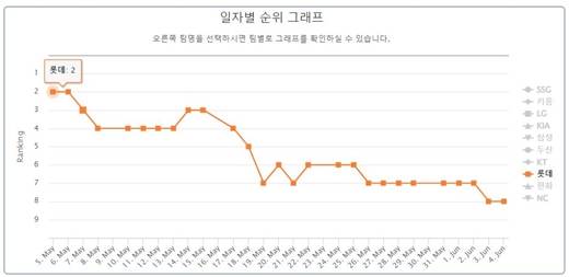 [롯데의 지난 한달간 순위 추락 그래프.사진=마이데일리 DB]- ⓒ마이데일리(www.mydaily.co.kr). 무단전재&재배포 금지 -