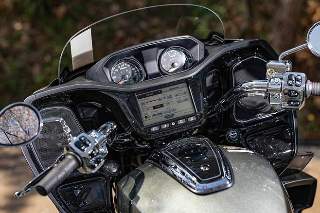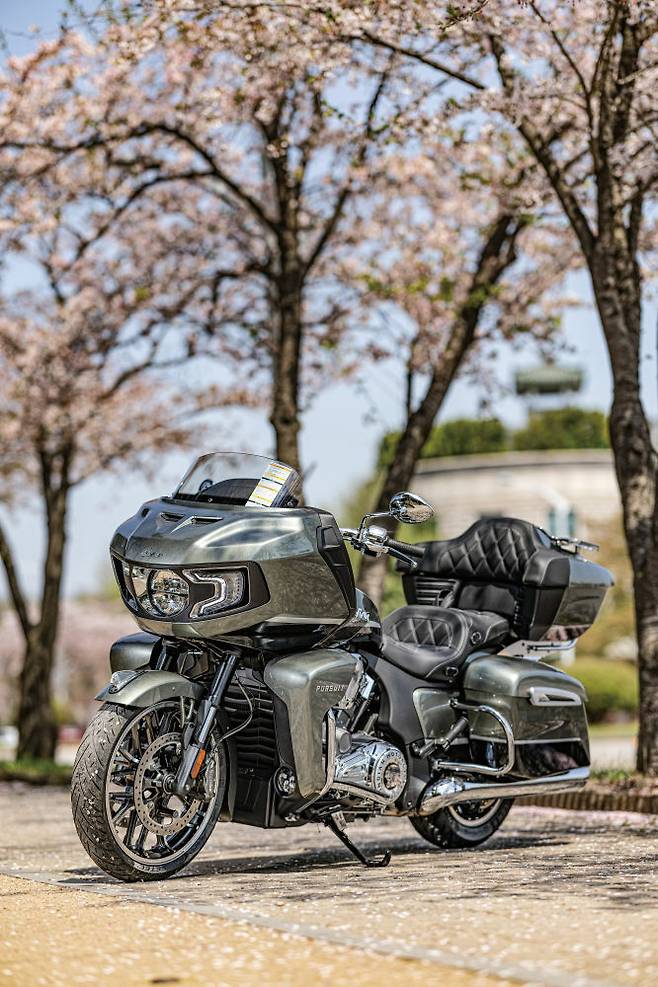 퍼슈트가 기존의 로드마스터와 다른 점은 페어링이 핸들과 함께 움직이는 것이 아닌 프레임 마운트 방식을 사용해 가벼운 핸들링 성능을 보여주는 것이다. 여기에 공랭 썬더스트크 엔진 대신 수랭 엔진이 장착된다. 1,768cc 파워플러스 엔진은 최고출력 121마력에 토크는 무려 178Nm에 달한다. 그리고 이를 부드럽게, 혹은 화끈하게 다듬어 줄 3가지 주행모드가 탑재되어 있다. 또한 장갑을 끼고도 조작이 편리한 7인치터치 디스플레이는 애플카플레이를 지원한다.