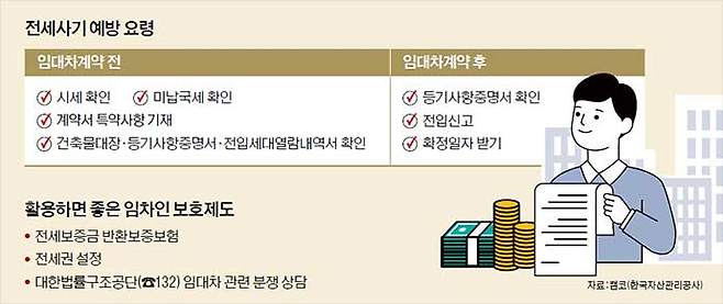 A씨처럼 전세보증금을 잃는 피해자가 늘고 있다. 캠코(한국자산관리공사)는 최근 집주인의 세금 체납 등으로 전세금을 돌려받지 못한 사례가 많다고 경고했다. 전세사기를 피하려면 어떻게 해야 할까. 임대차계약 전후 유의사항을 살펴보자.
