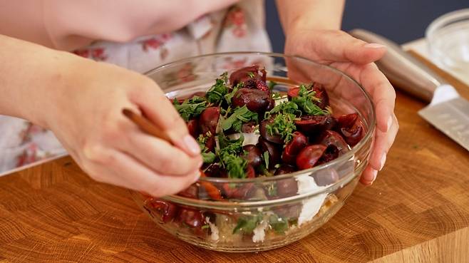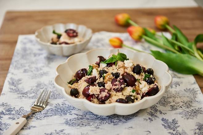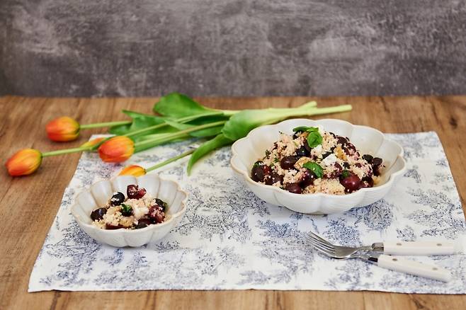 제철 체리를 넣은 쿠스쿠스 샐러드 레시피를 소개합니다. 아래 레시피는 가열된 조리법이며, 앞서 언급한 대로 쿠스쿠스는 불 없이 익혀도 요리가 가능합니다.