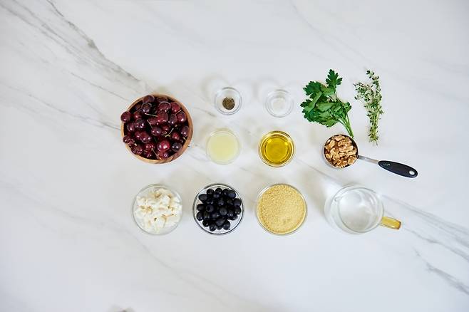 올리브오일(엑스트라 버진) 3큰술, 쿠스쿠스 1컵, 생체리 1.5컵, 씨를 제거한 블랙 올리브 3/4컵, 살짝 다진 구운 호두 1/3컵, 페타치즈 크럼블 3/4컵, 레몬즙 3큰술, 생 타임잎 1큰술, 소금과 후추 적당량, 다진 생 파슬리 1큰술, 물 1.5컵