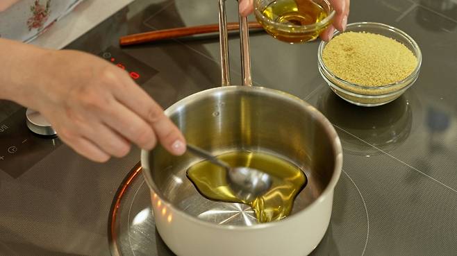 2. 중간 사이즈 소스팬에 올리브유 1큰술을 넣고 중불로 가열한다.