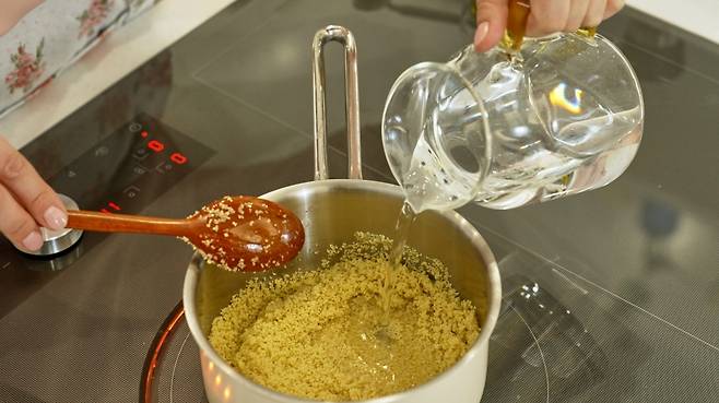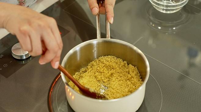 3. 소스팬에 쿠스쿠스를 넣고 약 3분 정도 저으면서 굽는다.