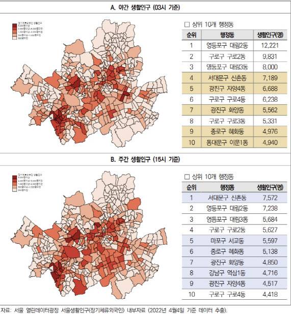 주간 생활인구는 서대문구 신촌동, 영등포구 대림2동·대림3동, 구로구 구로2동, 마포구 서교동, 종로구 혜화동, 광진구 화양동, 강남구 역삼1동, 광진구 자양4동, 구로4동 등의 순으로 높았다.