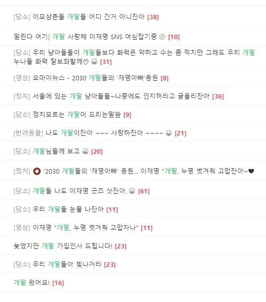 | ▲ 재명이네 마을에서 '개딸'로 검색하면 나오는 글들. |