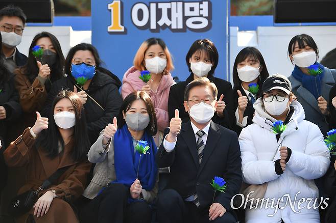 | ▲ 더불어민주당 이재명 대선후보가 지난 3일 오후 서울 종로 보신각터에서 열린 ‘우리 모두를 위해, 성평등 사회로’ 유세에서 여성 유권자들과 기념촬영을 하고 있다. 왼쪽은 "추적단 불꽃" 출신 박지현 민주당 여성위 디지털성범죄근절특위 위원장. |