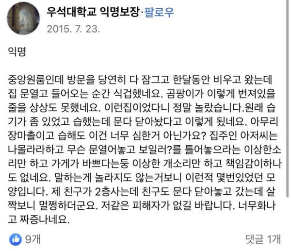 해당 사진은 2015년 7월 전북 우석대 학생 A씨가 페이스북에 올린 것이다. A씨는 “방문을 다 잠그고 한 달 동안 집을 비웠는데, 집 문 열고 들어오는 순간 식겁했다. 곰팡이가 이렇게 번져있을 줄 상상도 못했다”라며 “아무리 장마철이라고 해도 이건 너무 심한 것 아니냐, 집주인 아저씨는 나몰라라 하면서 문 열고 보일러 틀어놓으라는 둥 X소리만 한다”고 적었다. 이어 그는 “친구는 (같은 원룸 건물) 2층 사는데 살짝 보니 멀쩡해보였다”고도 했다.