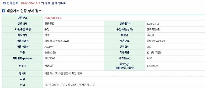 환경부에 따르면, 한국GM은 지난 8일 쉐보레 이쿼녹스에 대한 배출ㆍ소음 인증을 완료받았다. 신차는 3세대 이쿼녹스의 부분변경 모델로, 디젤 대신 가솔린 엔진을 주력으로 채택했고, 가격을 낮추고 상품성을 보강해 경쟁력을 키운 모델이다.
