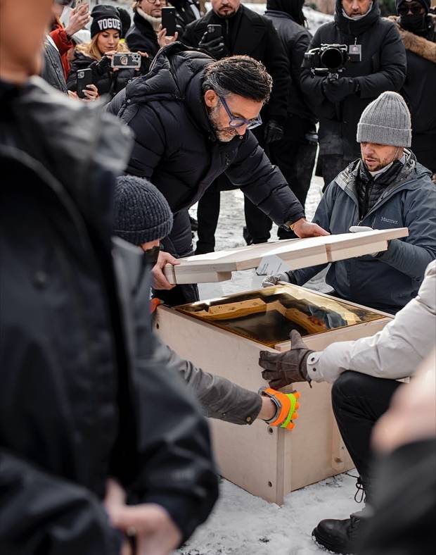 이날 아침, 뉴욕 센트럴 파크 음악공연장 나움버그 밴드쉘에 번쩍이는 황금 큐브가 나타났다. 큐브는 하얀 눈밭과 어우러져 더욱 순진무결한 빛을 자아냈다.