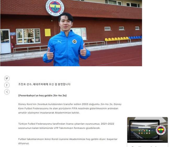 또한, 한국어로 "조진호 선수, 페네르바체에 오신 걸 환영합니다"라고 작성했다.