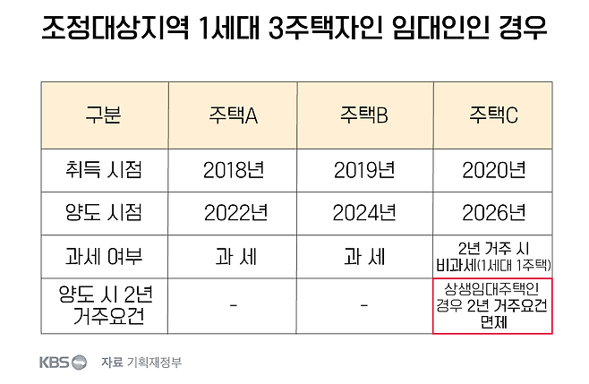 A·B·C 주택 3채를 보유한 다주택자가 C 주택의 임대료를 5% 이내로 올린 뒤 먼저 A 주택과 B 주택을 처분한다면, 이 사람은 나중에 C주택(상생 임대주택)을 처분할 때 실거주 요건 없이 양도세 비과세 혜택을 받을 수 있게 되는 겁니다.