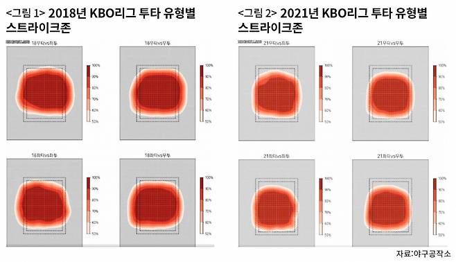 〈그림 1〉과 〈그림 2〉는 야구 콘텐츠 그룹인 야구공작소가 제작한 2018년과 2021년 KBO리그 투타 유형별 스트라이크존이다. 실선으로 표시된 작은 직사각형이 규칙상 존이다. 큰 실선 직사각형은 규칙상 존 각 변을 야구공 반 개 너비만큼 늘린 것이다. 색으로 표현한 분포는 트래킹 장비로 측정된 투구가 영역별로 스트라이크 판정을 받은 확률을 나타낸다. 색이 짙을수록 확률이 높고 옅을수록 낮다.