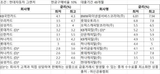 여신금융협회에 따르면 현대자동차 그랜저를 할부(현금구매비율 10%, 대출기간 48개월)로 구매할 때 카드사들은 연 2.2~5.5% 금리를 적용하지만, 캐피탈사는 연 2.7~7.9%로 금리가 다소 차이가 난다. 또한 최저금리에서도 삼성카드(연 2.2%), 우리카드(2.2%), 하나카드(2.6%), 신한카드(2.8%)가 2%대 금리를 적용하고 있다. 반면, 캐피탈사는 현대캐피탈(2.7%)만이 2%대 금리를 적용하며, 하나캐피탈, 롯데캐피탈 등에서만 4% 이하의 금리로 제공하고 있다. 카드사 자동차할부 금융시장에서는 신한카드와 KB국민카드가 2강을 형성한 가운데 우리카드와 하나카드가 뒤쫓는 양상이다. 우리카드의 자동차 할부 자산은 지난해 말까지 1조5735억원으로 1년전(1조676억원) 대비 47.40% 늘었다. 우리카드는 올 초 기존 오토금융본부에 오토신사업팀을 신설하는 조직개편을 진행하면서 경쟁력 강화에 나서고 있다. 하나카드도 자동차 할부 시장 진출 첫 해인 지난해부터 관련자산으로 3657억원을 달성하면서 빠른 성장세를 기록했다.