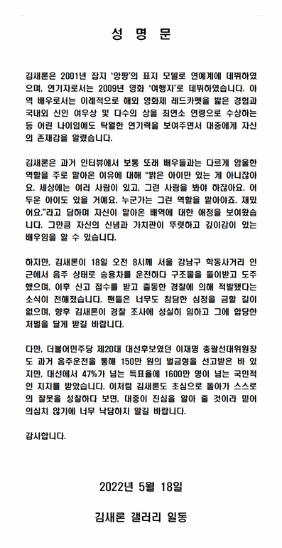 이번 사태를 두고 김새론 씨의 팬들은 18일 입장문을 발표하기도 했다. 디시인사이드 김새론갤러리는 성명을 내고 “김새론이 경찰 조사에 성실히 임하고 그에 합당한 처벌을 달게 받길 바란다”라고 밝혔다.