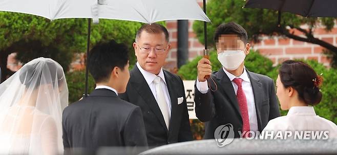(서울=연합뉴스) 김도훈 기자 = 정의선 현대차그룹 회장과 부인 정지선 씨가 27일 오전 장녀 진희씨 결혼식이 열리는 서울 중구 정동교회에서 드레스를 입은 딸을 바라보고 있다. 2022.6.27