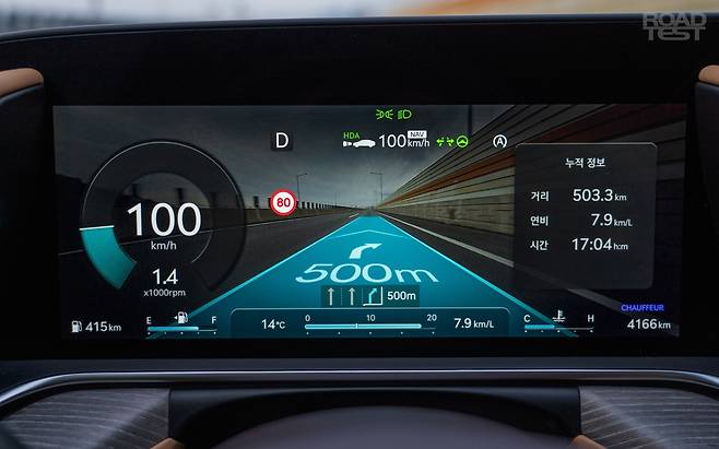 고속도로에 오르자, 12.3인치 디지털 계기판을 가득 채운 증강현실 내비게이션이 눈에 들어왔다. 확실히 중앙 모니터에 띄우는 방식보다 훨씬 보기 좋다. 내비게이션과 연동하면 도로 위에 다음 안내까지 남은 거리를 표시하고, 빠져나가야 할 램프 앞에 3D 화살표를 얹는다. 메르세데스-벤츠 S-클래스에도 비슷한 기능이 있지만, 이를 표시하는 중앙 모니터 위치가 낮아 시선 이동이 너무 잦았다.