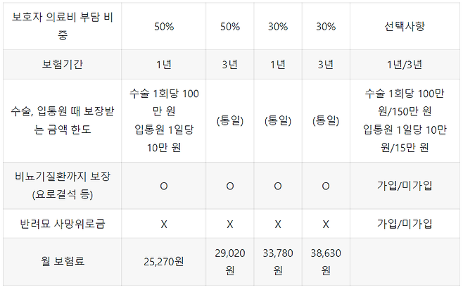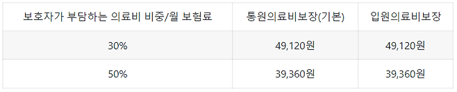 보호자가 부담하는 의료비 비중에 따라 보험료가 달라진다. 보호자가 의료비로 50%를 부담할지, 30%를 부담할지 결정할 수 있다.