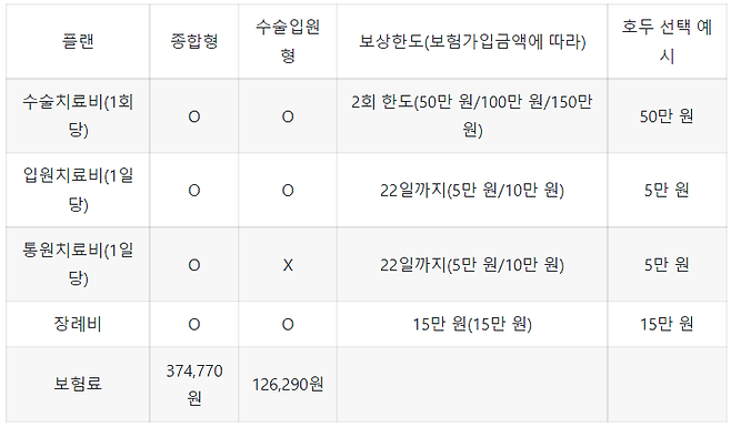 보험가입금액을 높일수록 보험료도 올라간다. 종합형과 달리 수술입원형은 통원치료비를 보상하지 않는다. 수술이나 입원에 해당하는 비용한 보상한다.