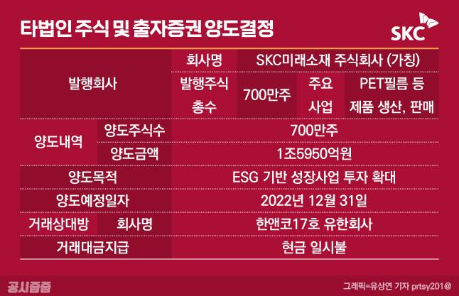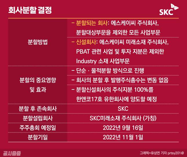 SKC는 'Industry소재' 사업을 떼어내 SKC미래소재 주식회사(가칭)라는 새로운 회사를 만들어 지분율 100%의 완전자회사로 만들 예정인데요.