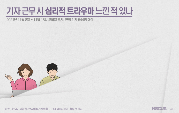 기자들 중 일부는 '트라우마'를 호소하기도 합니다. 지난 4월 한국기자협회(이하 기협)와 한국여성기자협회가 현직 기자 544명을 대상으로 '기자 트라우마 실태조사'를 실시했습니다. 그 결과, 기자 10명 중 8명은 근무 중 '심리적 트라우마'를 느낀 적 있다고 답했습니다.