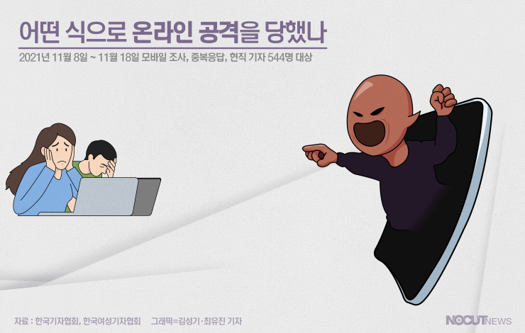 기자들은 일상적으로 공격 받는다고 느끼고 있습니다. 기자라는 이유로, 특히 특정 기사로 공격당한 적 있냐는 질문에 응답자 544명 중 약 78%인 424명이 '있다'고 답했습니다. 또 지난 1년간 어떤 식으로 온라인 공격을 당한 적 있는지 묻자, 약 75%인 409명이 '기사 댓글로 조롱당했다'를 꼽아 가장 많은 유형으로 나타났습니다.