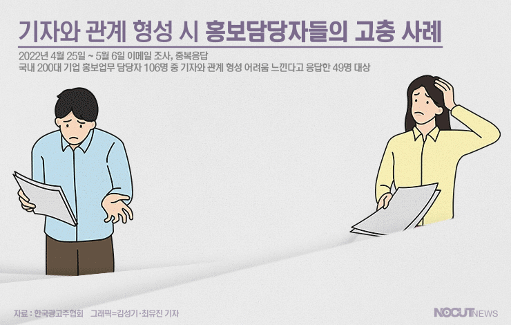 언론 자체에 대한 반감을 넘어 기자에게도 부담을 느끼는 이들이 있습니다. 최근 한국광고주협회가 국내 200대 기업 홍보업무 담당자 106명을 대상으로 설문조사했더니 절반가량인 46.2%가 기자와의 관계 형성 및 유지에 어려움을 느낀다고 밝혔습니다.