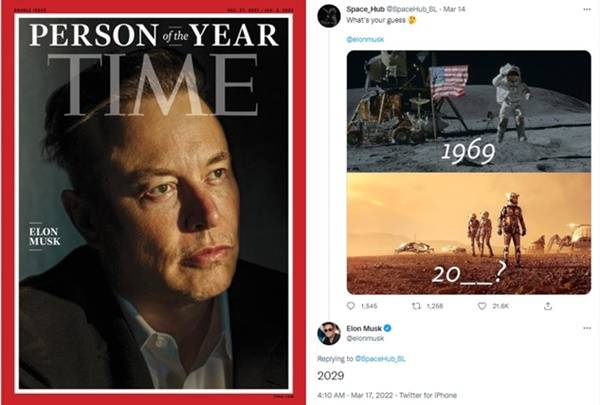 일론 머스크 스페이스X 최고경영자(CEO)가 인류의 화성행에 대해 이같은 전망을 트위터에 올렸다. 이는 그가 지난해 말 언급했던 시점보다 3년 늦춰진 것이다. 이는 인류가 최초로 달에 도달한 1969년으로부터 60년째 되는 시점이기도 하다.