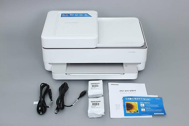 삼성전자 잉크젯 복합기 SL-J1780DW는 본체와 간단 설치 설명서와 제품 보증서, 전원 코드, USB 케이블, 그리고 두 개의 잉크 카트리지가 기본 구성품으로 제공된다.