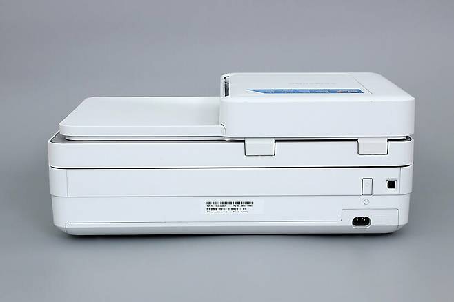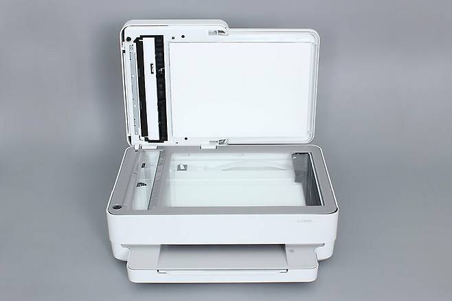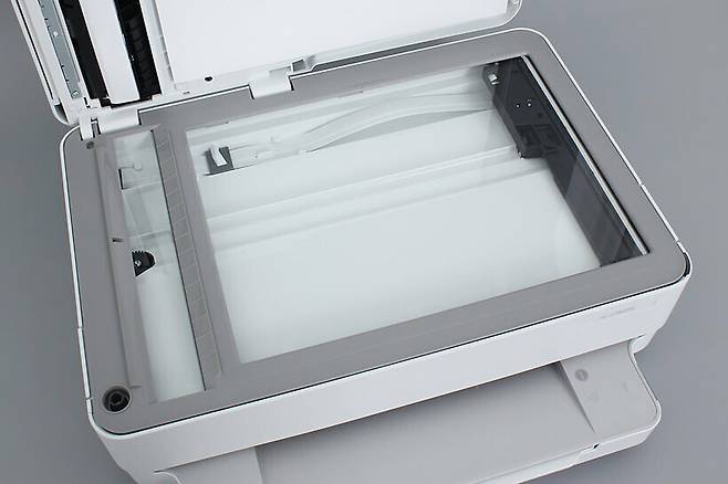본체 윗부분 전체를 들어 올리면 스캐너가 나타난다. 스캔 영역의 평판유리를 보면 넓은 부분과 좁고 긴 부분으로 나뉘어 있는데, 넓은 부분은 스캔할 종이를 직접 올려두고 스캔하는 플랫 베드이고, 좁고 긴 부분은 자동 급지 장치를 이용해 스캔할 때 사용되는 영역이다.