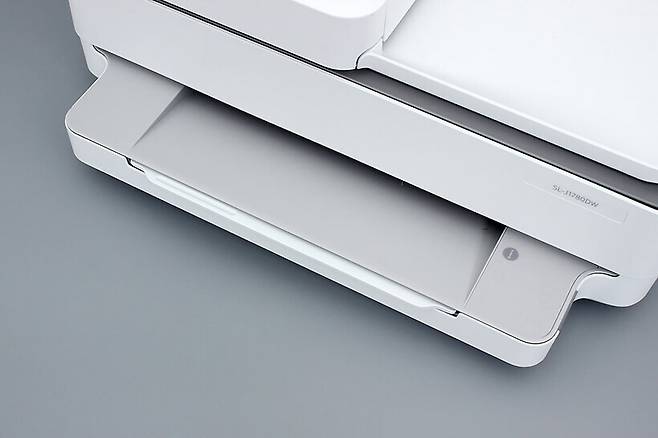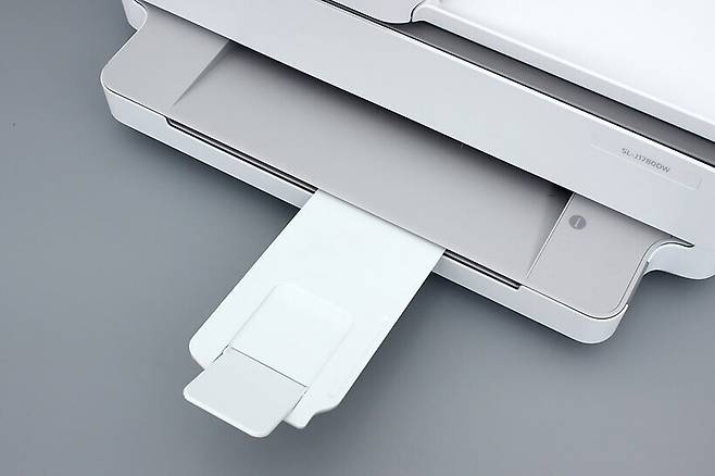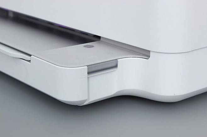 본체 앞부분에는 밝은 그레이 컬러로 된 출력 용지대가 있다. 인쇄나 복사를 했을 때 결과물이 이 부분으로 나오게 되는데, A4 용지 기준으로 생각했을 때 용지대가 너무 짧게 보인다. 하지만 살짝 튀어나와 있는 흰색 부분을 앞쪽으로 잡아당기면 숨겨져 있던 출력 용지함 확장대가 나타난다. 평소 복합기를 사용하지 않을 때에는 확장대를 출력 용지대 안쪽으로 접어서 숨겨두면 공간도 절약되고 깔끔하게 사용할 수 있다.