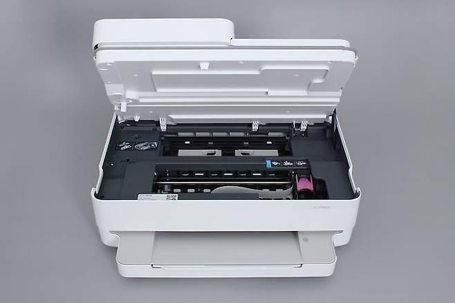 좌우 손잡이를 열고 잉크 카트리지 교체 덮개를 열면 잠시 후 오른쪽 끝에 살짝 가려져 있던 카트리지함이 왼쪽으로 이동하면서 완전히 노출되는데, 이 상태에서 카트리지함 덮개를 열고 잉크 카트리지를 넣은 후 다시 덮개를 닫아주면 된다. 카트리지함 덮개도 카트리지 윗면과 동일한 색상으로 되어있어서 위치를 쉽게 알 수 있다.