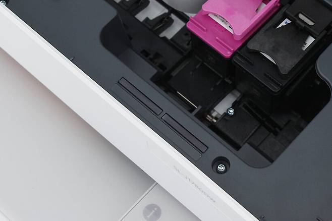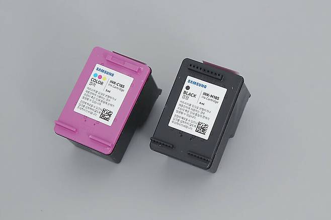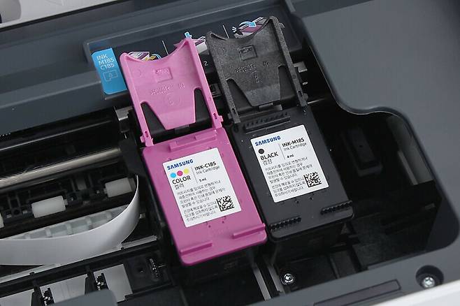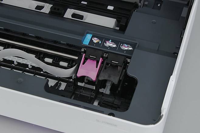 처음 구입 후 사용할 때는 잉크 카트리지를 장착해주어야 한다. 삼성전자 잉크젯 복합기 SL-J1780DW는 컬러와 검정 두 가지 잉크를 사용하는데, 컬러 잉크 카트리지는 윗면이 마젠타 색상으로 되어있어서 구분하기 쉽다.