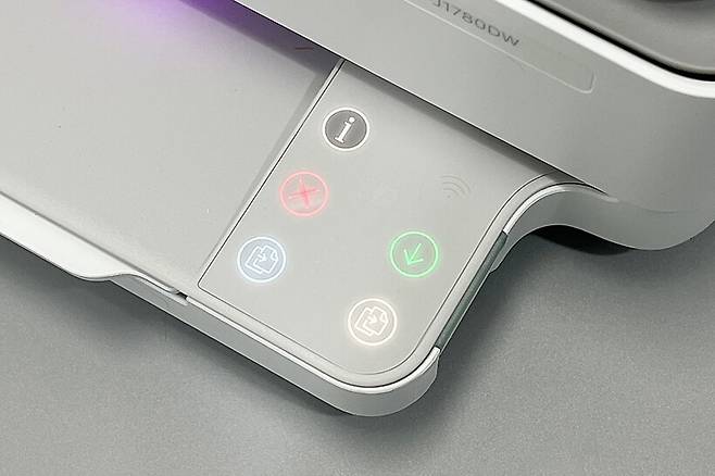 본체 앞부분의 밝은 그레이 컬러로 돌출된 부분 제일 오른쪽에는 영문 소문자 i가 표시된 동그라미가 있는데, 자세히 보면 그 아래쪽으로 X 표시와 아래쪽 화살표 표시 등 다양한 표시가 보인다. 이 부분은 삼성전자 잉크젯 복합기 SL-J1780DW의 조작부로, 희미하게 보이는 이미지가 터치 방식의 버튼이다.