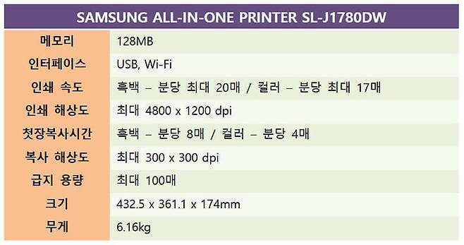 삼성전자 잉크젯 복합기 SL-J1780DW는 팩스 기능을 제공되지 않지만 가정에서는 대부분 필요치 않은 기능이기 때문에 큰 문제는 되지 않는다. 그 이외에는 인쇄와 복사, 스캔 등 필요한 모든 기능이 제공되며, 인쇄 속도도 흑백은 20ppm 컬러는 17ppm으로 만족스러운 수준이다. 또한 출력 해상도도 4800x1200dpi로 높은 편이며, 스캔 해상도 또한 1200x1200dpi로 뛰어난 화질로 스캔이 가능하다. 그뿐만 아니라 무선 연결도 지원되기 때문에 방마다 프린터를 놓을 필요 없이 모든 가족 구성원들이 무선으로 복합기를 사용할 수 있으며, 스마트폰 연결도 가능해 더욱 편리하게 출력할 수 있다. 그뿐만 아니라 자동 급지 장치를 이용해 여러 장을 스캔하거나 복사할 때 한 장씩 바꿔줄 필요 없이 한 번에 간편하게 출력할 수 있어서 가정용 또는 소규모 사무실용 복합기로는 부족함이 없는 기능과 성능을 제공해준다.
