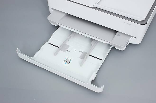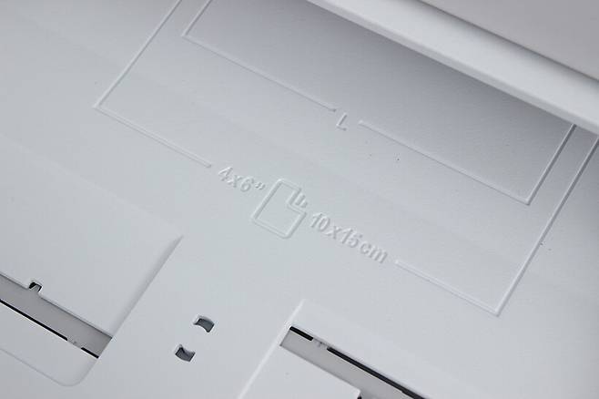 출력 용지대 아랫부분을 앞쪽으로 잡아당기면 용지함이 나타난다. 용지함에는 최대 100매의 A4 용지를 수납할 수 있으며, 용지 너비 조절 가이드를 이용해 다양한 규격의 용지를 사용할 수 있다. 용지함 표면에는 지원되는 다양한 용지의 크기가 표시되어 있다.