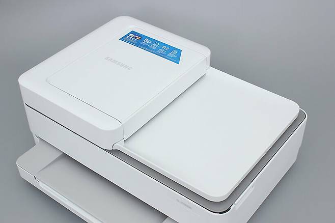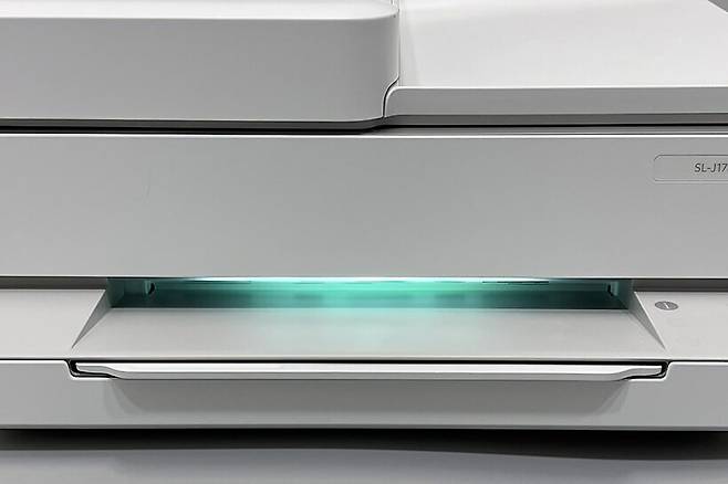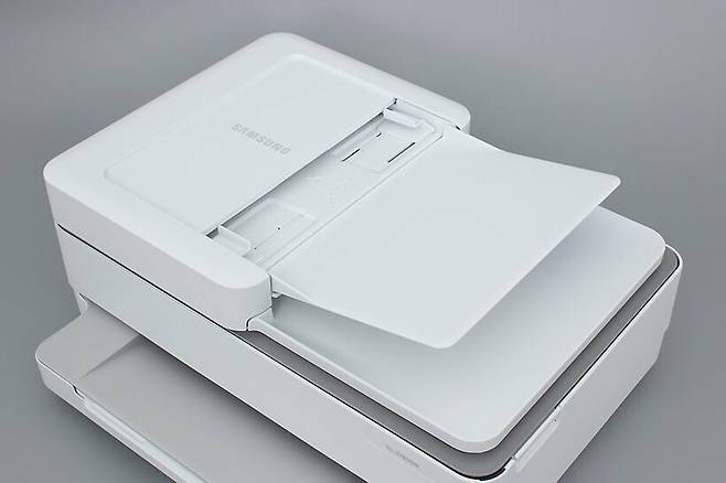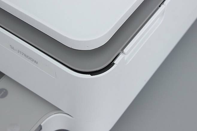 삼성전자 잉크젯 복합기 SL-J1780DW의 윗면은 좌우 비대칭 형태를 띠고 있다. 더 높게 튀어나와 있는 왼쪽 편은 여러 장의 문서를 스캔할 때 사용하는 자동 급지 장치로, 급지대를 열고 닫을 수 있어서 자동 스캔을 사용하지 않을 때는 깔끔하게 닫아둘 수 있다. 원본 급지대를 열면 안쪽에 너비 조절 가이드가 있어서 스캔할 문서의 너비에 맞춰 조절할 수 있다.