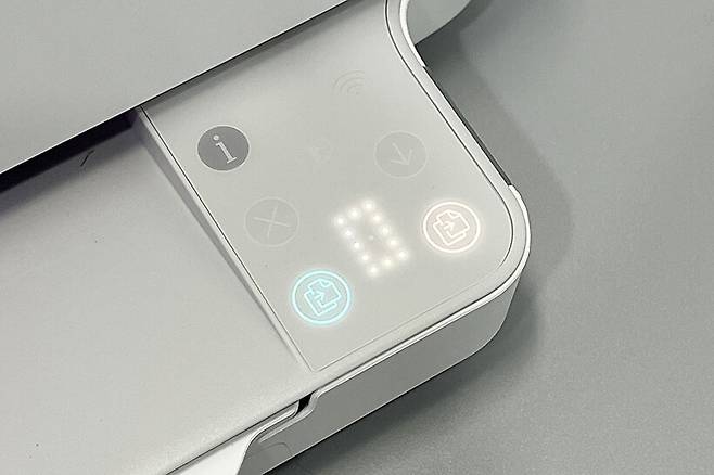 복사를 할 때에는 복사 버튼을 여러 번 눌러 복사 매수를 변경할 수도 있는데, 두 복사 버튼 사이에 숫자가 나타나 현재 설정된 매수를 확인할 수 있다. 숫자 버튼 위에도 자세히 보면 자그마한 아이콘이 보이는데, 용지 걸림 등의 오류가 발생했을 때 황색으로 켜진다. 다시 시작 버튼 위에도 아이콘이 하나 있는데, 무선 설정이 완료되어 연결되면 파란색으로 와이파이 모양이 켜진다.