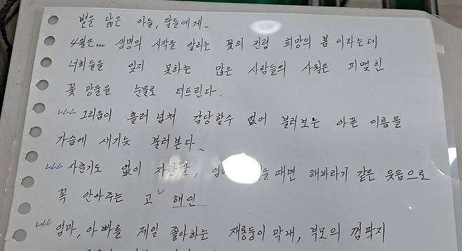 | ▲ 임영애 씨가 세월호 단원고 희생학생들을 추모하며 쓴 손편지. |